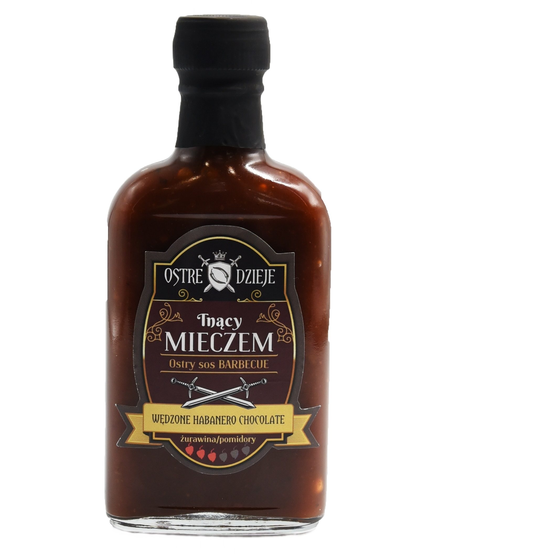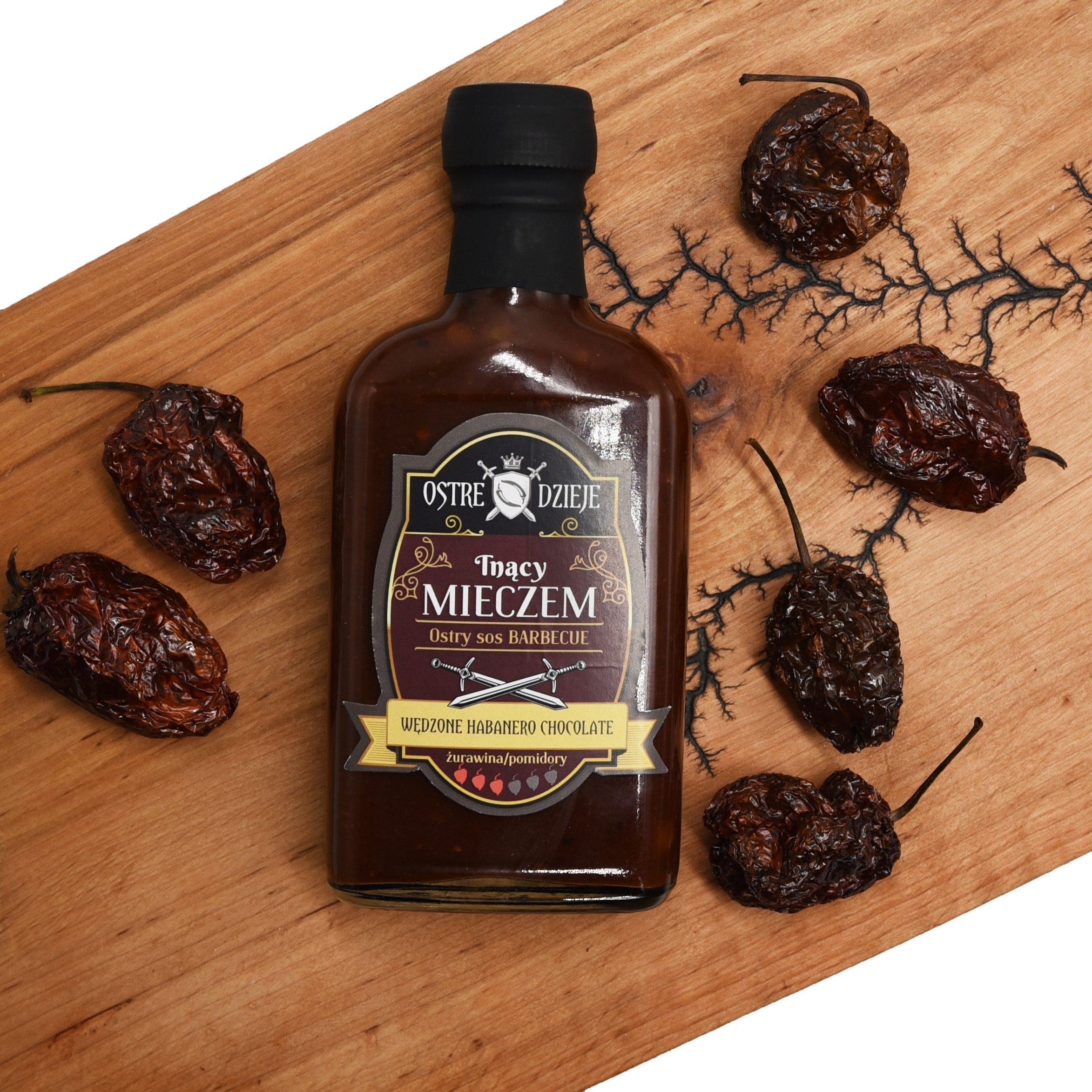 Tnący MIECZEM – ostra, choć nieco lżejsza od “Ziejącego OGNIEM” wersja sosu, którego bazę stanowi połączenie wędzonych papryczek Habanero Chocolate (~450 000 SHU) z legendarnym sosem Worcester o niezwykle bogatym wachlarzu aromatów. Dymność w tej kompozycji została skontrowana żurawiną, która nadaje owocowej słodyczy, limonką oraz pomidorami. Użyliśmy tu tylko czekoladowych Habanero, które charakteryzuje wyższa ostrość niż w przypadku czerwonych Habanero. Na naszej skali sos dostał 3*, ale w subiektywnym odczuciu jest ostrzejszy od innych ostrodziejowych sosów gotowanych w wersji Habanero.
