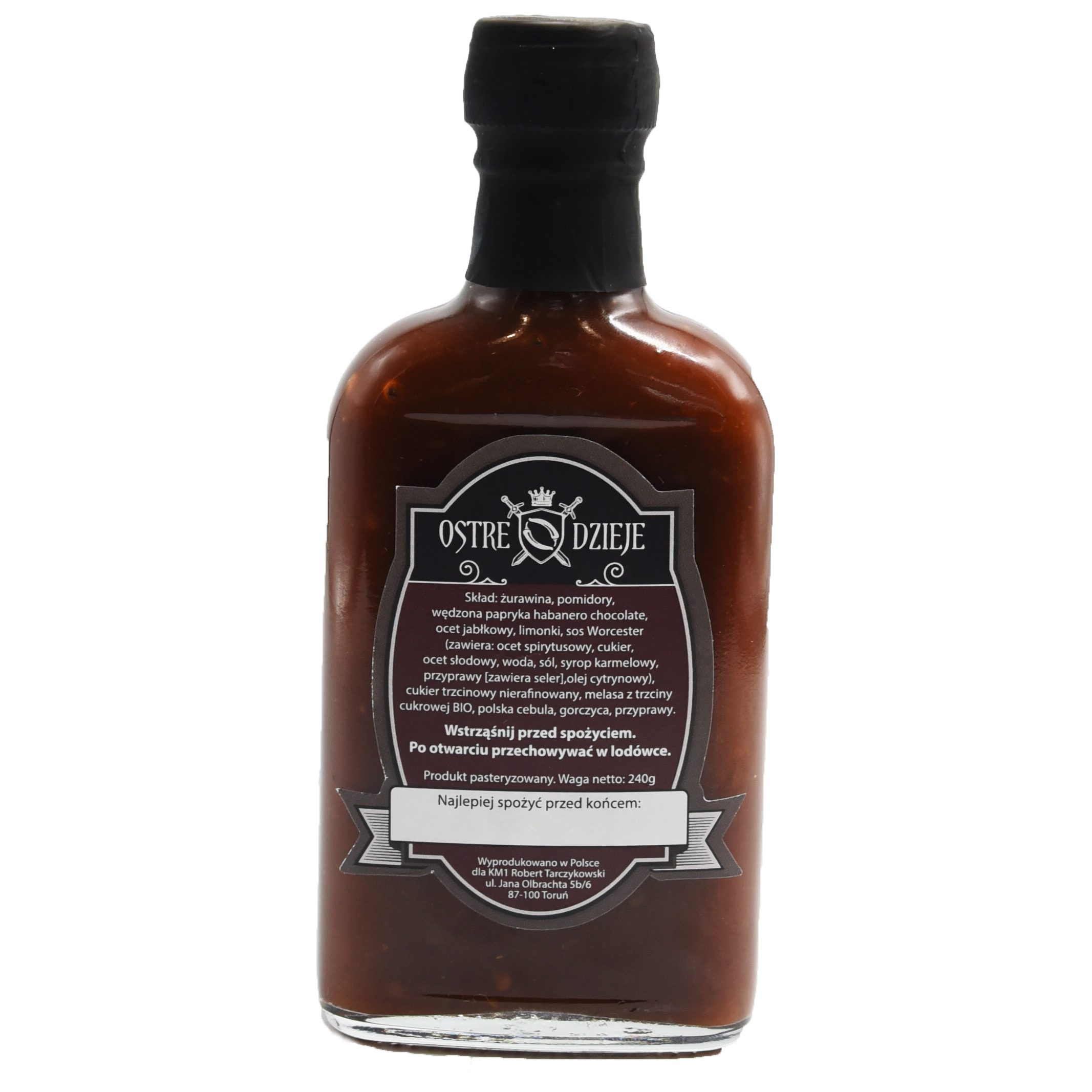 Skład: żurawina, pomidory, wędzona papryka Habanero Chocolate, ocet jabłkowy BIO, limonki, sos Worcester (zawiera: ocet spirytusowy,cukier,ocet słodowy,woda,sól,syrop karmelowy,przyprawy [zawiera seler],olej cytrynowy), cukier trzcinowy nierafinowany, melasa z trzciny cukrowej BIO, polska cebula, gorczyca, przyprawy.