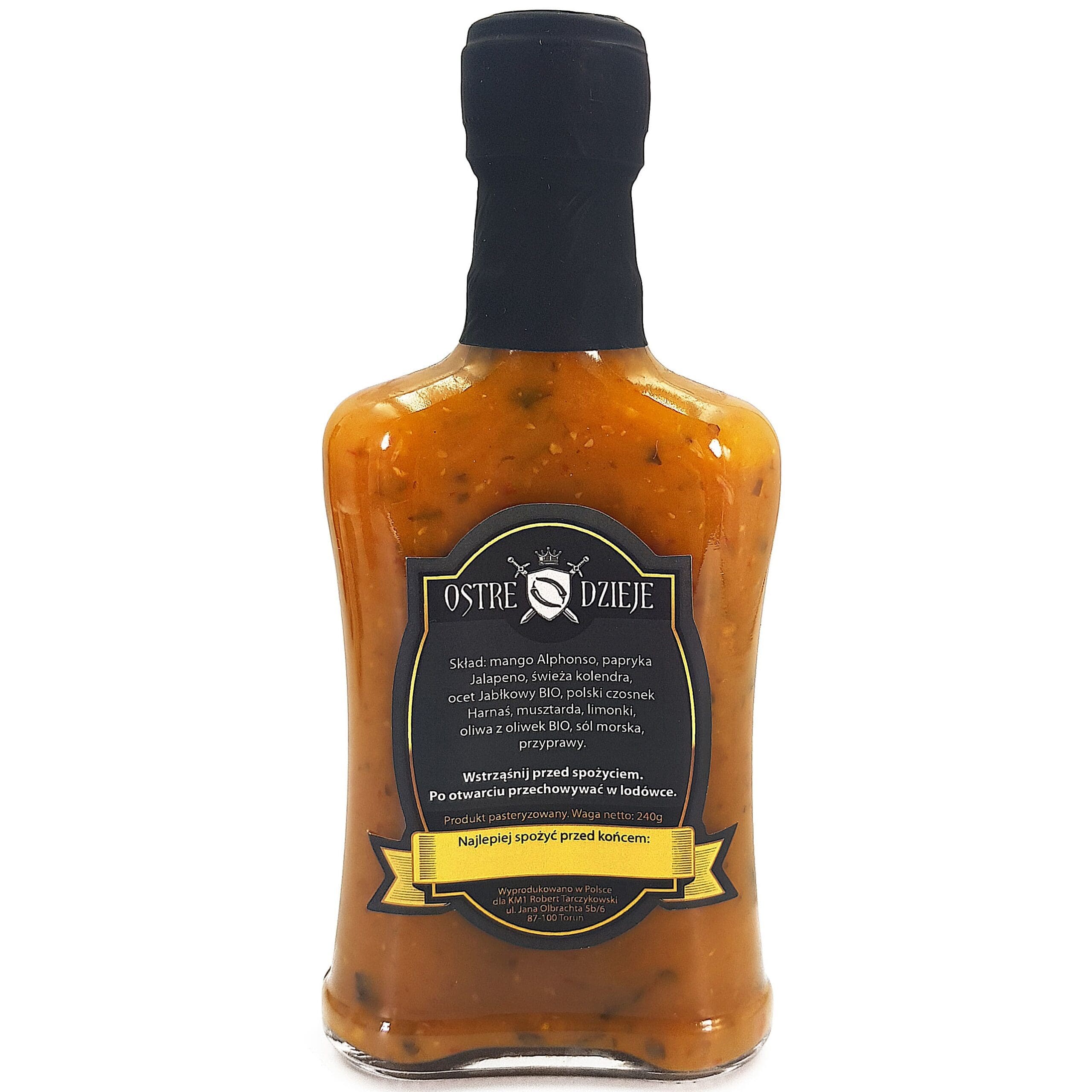 Skład: mango alphonso, papryka jalapeno, świeża kolendra, ocet jabłkowy BIO, polski czosnek Harnaś, musztarda, limonki, oliwa z oliwek BIO, sól morska, przyprawy.